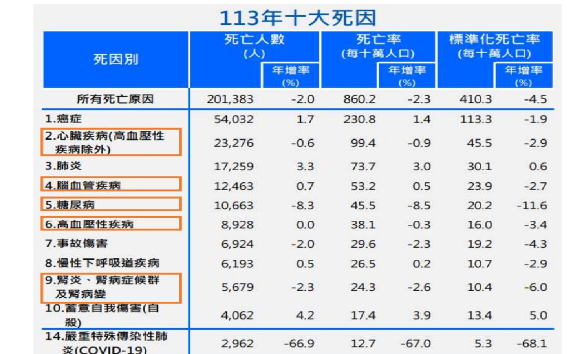 依據113年十大死因統計,三高(高血脂、高血壓、高血糖)慢性病占十大死因的50%。2019–2023年國民營養健康調查顯示,30歲以上國人三高盛行率於30-39歲人口有高血脂占18.7%、高血壓9.7%及高血糖2.5%,並隨年齡增加而上升。多數年輕族群自覺風險偏低、症狀不明顯,易錯失早期介入契機。過去40歲才開始提供成人預防保健服務服務,已不足以因應現代生活型態與慢性疾病年輕化的挑戰。