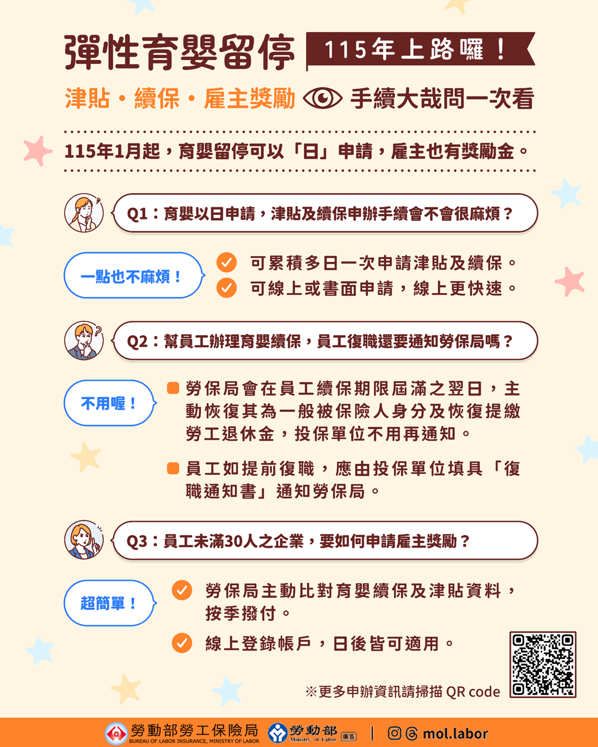 勞動部特別提醒,為順利推動彈性育嬰留停,勞保局已配套簡化相關申請程序,無論是津貼之請領、育嬰續保資格及退休金提繳之恢復、雇主獎勵金之撥付等資訊,及線上申辦1分鐘操作教學影片、簡易試算工具、常見問答(QA)等,都可至勞保局官網首頁之「彈性育嬰留職停薪專區」(https://www.bli.gov.tw/0109290.html)瀏覽參考,歡迎各界多加利用。2025/12/30
