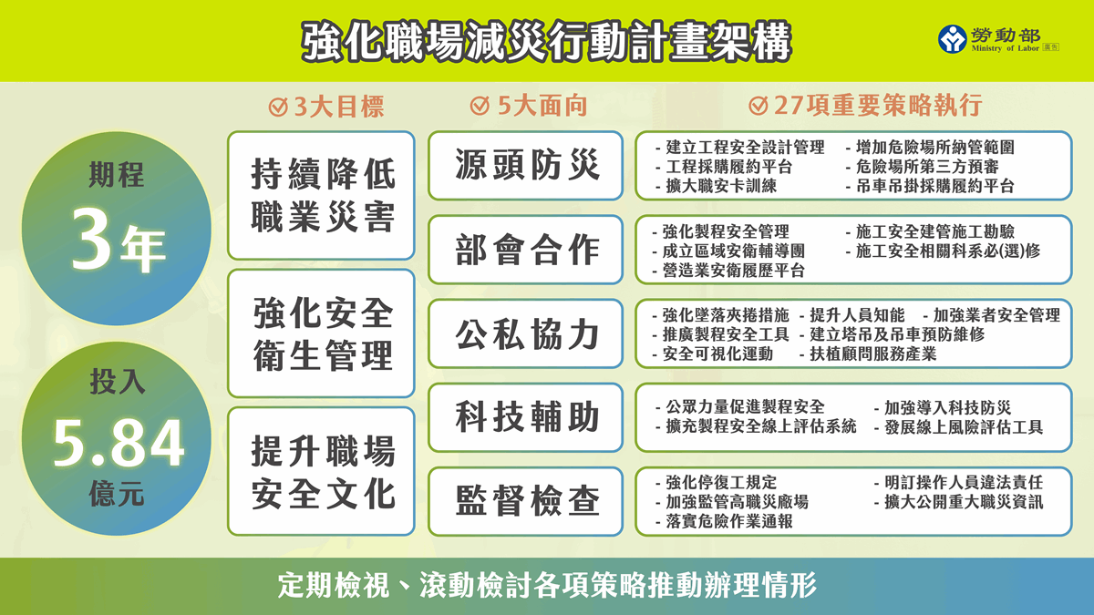 勞動部說明,國際經驗顯示,美國、歐盟、英國、日本等國家突破職災瓶頸的關鍵在於「制度改變」與「源頭管理」,將防線往前推,如擴大化學品管制,強化製程安全管理,及建置線上互動式風險評估工具,協助小微型事業自主風險辨識與評估,並善用專業機構或公協會等防災資源,透過公私協力擴大防災效能。因此,為讓新修正職安法真正落實,本次行動計畫針對廠場推動重要策略如下: