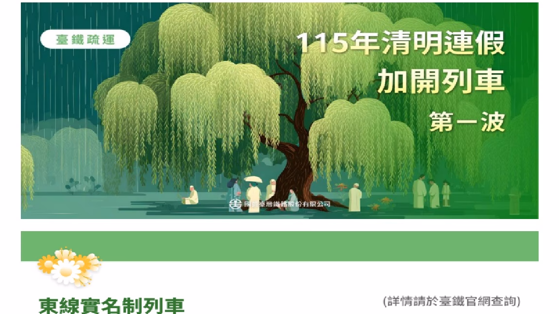 【記者姚宜君/台北】臺鐵公司因應115年清明節疏運旅客需要,自115年4月2日(星期四)起至4月7日(星期二)止計6天,全線加開各級列車共計165列次(西線58列次、東線86列次、南迴線21列次)。其中包含東線實名制列車6列次、北半環跨線自強號列車10列次、南半環跨線自強號列車15列次、西部幹線自強號列車26列次。另為加強疏運旅客,自4月2日至4月7日止暫停發售親子車廂車票,改以一般車廂方式售票。