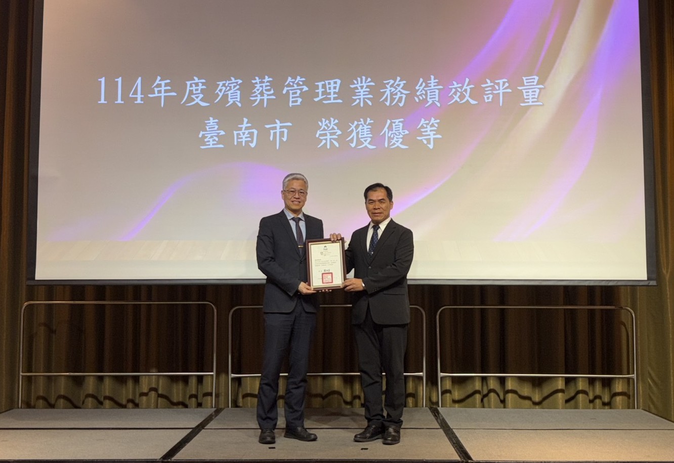【記者邵潤玲/台南】內政部每2年辦理1次「直轄市、縣(市)政府殯葬管理業務評量」,今(17)日舉行114年度頒獎典禮,由內政部政務次長吳堂成頒獎,臺南市府民政局副局長吳明熙代表局長姜淋煌接受表揚。臺南市憑藉殯葬管理政策推動與服務品質整體表現,榮獲全國優等肯定,在市長黃偉哲任內期間已連續6年3次皆獲中央優等獎肯定,展現臺南市政府在殯葬管理制度與公共服務上的卓越成果。