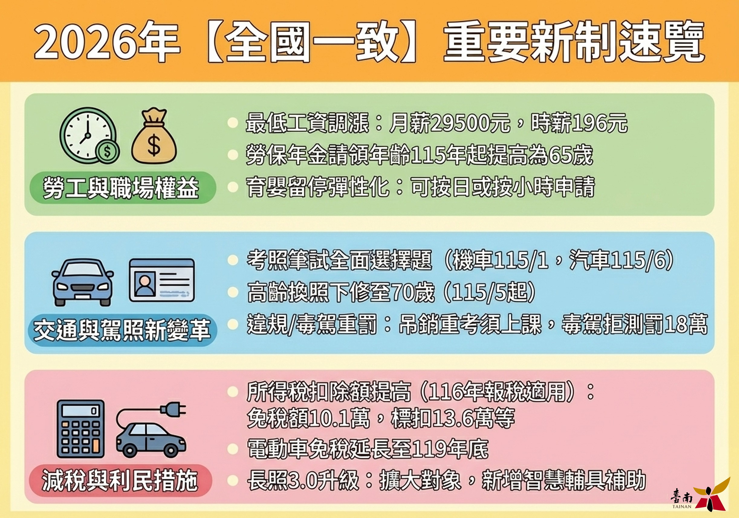 【記者陳怡如/台南】迎接嶄新的2026年,台南市政府貼心為市民朋友整理即將上路的新制措施,其中不僅有全國一致實施的重要制度,更有多項「台南限定」的加碼與創新作為,直接回應市民需求、照顧在地生活。市府邀請市民朋友提早掌握重點,讓新制度成為新年度的最佳助力。