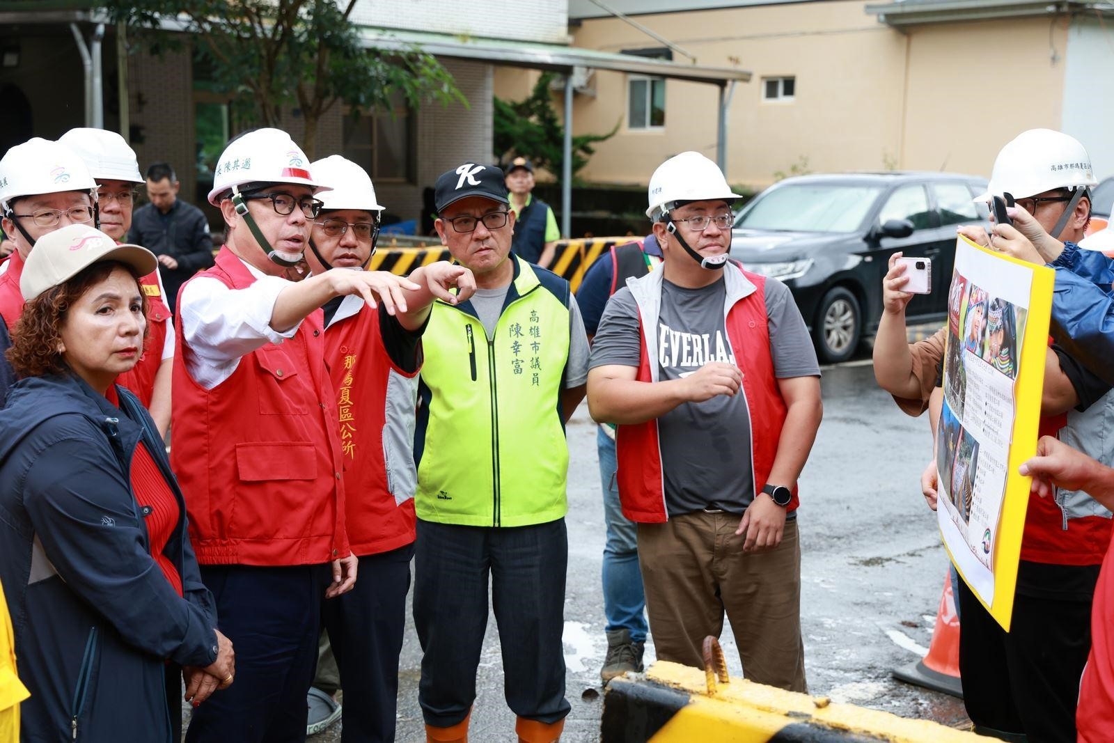 陳其邁聽取那瑪夏區長孔賢傑簡報,那瑪夏區達卡努瓦里秀嶺巷,日前受豪雨影響野溪暴漲、水路改向造成農路下邊坡崩塌,影響30戶近百位族人生命財產,區公所積極爭取經費補助重建工程。