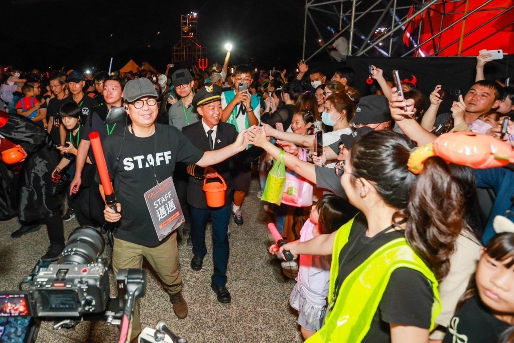 【記者陳采琳/高雄】喂!武營來搞怪!「2025高雄萬聖節」於衛武營國家藝術文化中心盛大登場,今(1)日全日累計吸引30萬人到訪,晚間創意裝扮遊行進入最高潮時,全場更湧入近7萬人。市長陳其邁今晚出席萬聖節遊行派對,以時下最流行的「地味」裝扮,化身演唱會工作人員,串場與大小朋友驚喜互動,共度萬聖節歡樂時光。