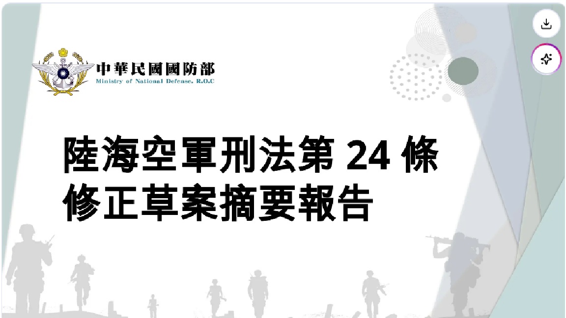 二、有關《陸海空軍刑法》第24條修正草案部分:加重現役軍人犯「不盡其應盡之責而降敵」罪之處罰,同時增訂其預備犯及陰謀犯之處罰,並增訂以言語、舉動等方式對敵人為效忠表示之犯罪類型及其刑責,以有效確保國家安全及軍事利益。