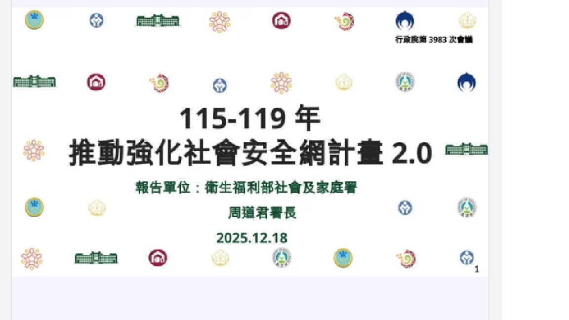 【記者姚碩彥/台北】行政院長卓榮泰今(18)日於行政院會聽取衛生福利部「115-119年推動強化社會安全網計畫2.0」報告後表示,為完備社會安全網的服務體系,政府自107年起陸續推動強化社會安全網第一、二期計畫。卓榮泰肯定衛福部、勞動部、內政部、教育部與法務部等部會,以及地方政府多年來的努力與付出,幫助處在風險邊緣的民眾與家庭獲得安全保護。