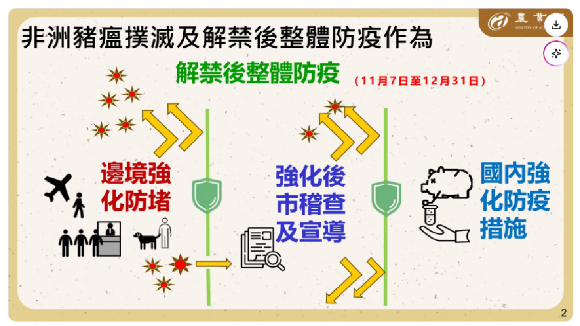 【記者姚碩彥/台北】行政院長卓榮泰今(13)日在行政院會聽取農業部及環境部「解除非洲豬瘟禁運禁宰後之防疫措施、產銷調節及廚餘去化」報告後表示,本次非洲豬瘟疫情,在經過迅速處置及三階段強化防疫措施強力防治之後,目前雖無其他案例,危機暫時稍減,但各項防疫工作仍不容鬆懈。接下來第四階段的防疫作為,中央與地方政府必須嚴格執行,持續強化預警監測工作,毛豬產業農友們也應自主落實生物安全檢測及措施,請農業部、財政部、經濟部、交通部及海洋委員會等相關機關,落實執行各項強化邊境管理的精進措施,防堵非洲豬瘟病毒入侵、阻絕疫情再次發生,確保維持清零狀態,並對所有業者展開全面性的協助與支持。